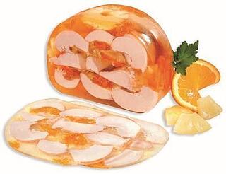 Hähnchenbruststücke mit Ananas und Mandarinen ins Aspik (Rindergelantine)