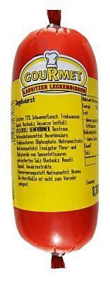 Brühwurst mit feinem, homogenem, hellrosanem Grundbrät, das mit kleinen Fleisch- und Speckstückchen sowie Senfkörnern durchsetzt ist. Im Kunstdarm Kal. 53 gefüllt.