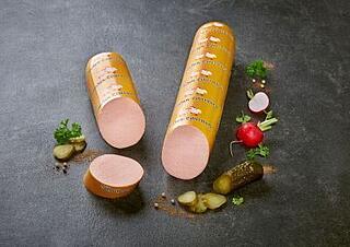 aus Hähnchenfleisch, herzhaft gewürzt, im Golddarm Kaliber 60