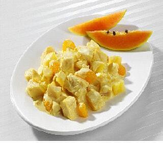 Zartes Geflügelfleisch mit Mandarinen und Ananas in einer fruchtigen Curry-Sauce Geflügelfleischeinwaage: 0,4 Kg