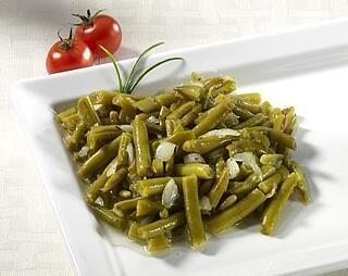 Feiner, grüner Bohnensalat mit Zwiebeln in klarem Aufguss