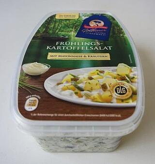 Verzehrfertig aus bißfest gegarten Kartoffelwürfeln, mit Gurken- und Zwiebelwürfeln und Gewürzen, in einer Sauce aus Mayonnaise, 8 Schalen im Karton