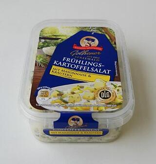Verzehrfertig aus bißfest gegarten Kartoffelwürfeln, mit Gurken- und Zwiebelwürfeln und Gewürzen, in einer Sauce aus Mayonnaise, 6 Schalen im Karton