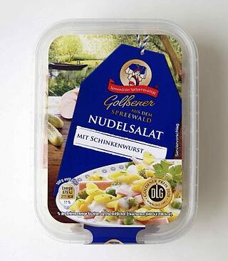 Verzehrfertige aus Spirelli-Nudeln mit Schinkenwurststreifen, mit Gurkenwürfeln, Erbsen, Maiskörnern und Blattgewürzen, in hellgelber Sauce aus Salatmayonnaise, 6 Schalen im Karton.